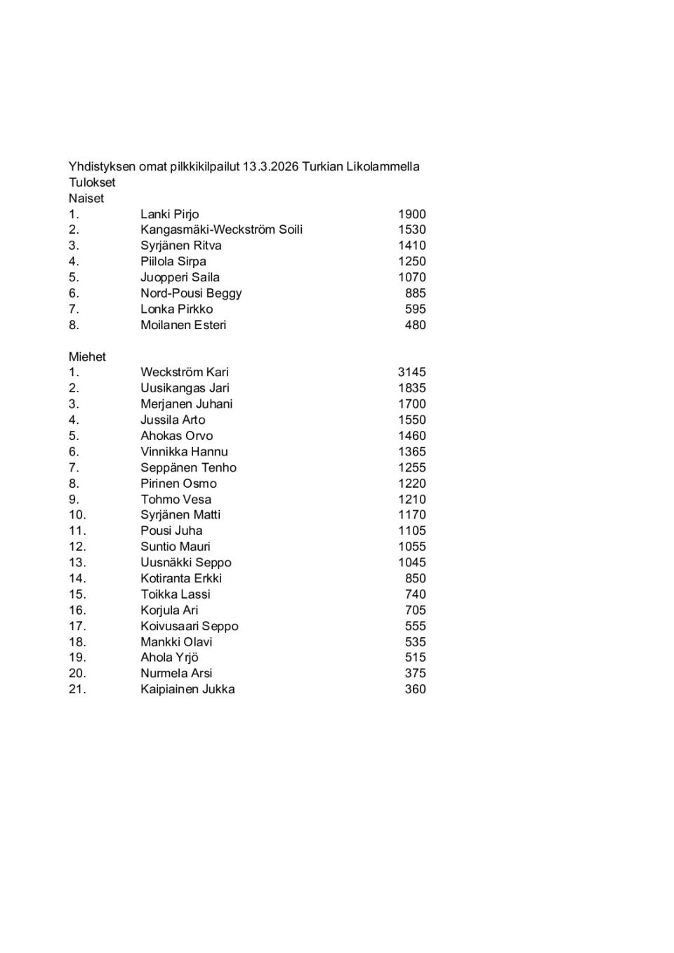 Kalakilpailun 13.3. tulokset